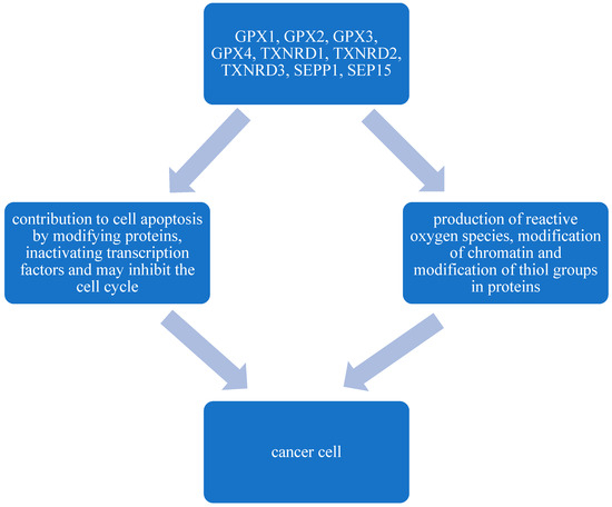 It has been shown that the strong pro-oxidant effect of Se disrupts the pro- and antioxidant balance by creating many reactive oxygen species. The effect of Se on cancer cells includes the production of reactive oxygen species, modification of chromatin, and modification of thiol groups in proteins. It has been shown that the element may also contribute to cell apoptosis by modifying proteins and inactivating transcription factors, and may inhibit the cell cycle (Figure 1) [30]. It is suggested, based on existing research, that Se may be helpful in the treatment of established cancers by cytotoxically damaging cancer cells. It has also been shown that SeO2 is used in the treatment of various malignant tumors, including lungs, the uterus, and prostate. It is also interesting that the use of Se can enhance the effect of radiation on hormone-independent, well-developed prostate tumors [31].