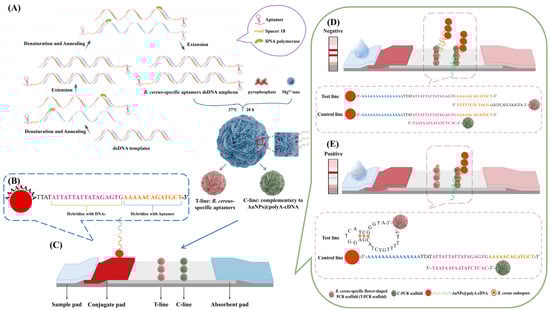 In the absence of B. cereus endospores, the cDNAa fragment of AuNPs@polyA-cDNA hybridizes with the aptamer at the T line, generating a distinct signal from AuNP accumulation (Figure 1D). In contrast, when B. cereus endospores are present, their binding to the aptamer inhibits the hybridization of AuNPs@polyA-cDNA with the aptamer, weakening the signal at the T line (Figure 1E). The C-PCR scaffold captures excess AuNPs@polyA-cDNA by hybridizing with the cDNAc fragment. Thus, regardless of the presence of B. cereus endospores, the probe is captured at the C line, producing a red band.