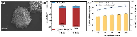 The flower-shaped PCR scaffold is a highly stable nano- to microscale structure formed by DNA self-assembly on a magnesium pyrophosphate backbone (Figure 2A). By modifying the nucleic acid sequences at the primer ends, we constructed two distinct flower-shaped PCR scaffolds: the T-PCR scaffold, which captures the target and is complementary to the AuNPs@polyA-cDNA nanoprobe, and the C-PCR scaffold, serving as a complementary sequence to the AuNPs@polyA-cDNA nanoprobe. The prepared scaffold has a distinct flower-like structure with a particle size of approximately 1.2–1.4 µm (Figure 2B), ensuring stable deposition on the NC membrane without migration due to capillary action. To assess DNA loading capacity, we measured nucleic acid concentration in the supernatant after the first centrifugation and calculated loading efficiency as: loading efficiency = (initial nucleic acid − remaining nucleic acid)/initial nucleic acid. As shown in Figure 2C, the scaffold achieved over 70% loading efficiency, indicating a high capacity for target sequence binding, which enhances its ability to recognize B. cereus endospores and cells, significantly improving sensor sensitivity.