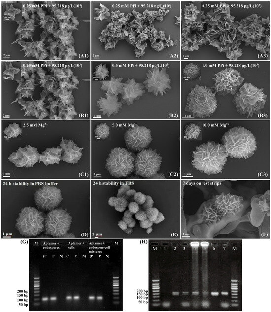 Morphological tunability, stability and endospores captive property of Flower-Shaped PCR scaffolds. Lower nucleic acid concentrations at a constant pyrophosphate level result in denser flower-like folds (A1–A3). Lower pyrophosphate concentrations at a constant nucleic acid level produce sparser folds (B1–B3). Magnesium ion concentration is critical for maintaining the flower-like morphology of PCR scaffolds under consistent nucleic acid and pyrophosphate conditions (C1–C3). The morphology of flower-like PCR scaffolds by SEM characterization after one week at 37 °C in PBS buffer (D), 100% fetal bovine serum (E), and on test strips as capture probes (F). Agarose gel electrophoresis (AGE) characterized the capture abilities of nucleic acid aptamers for B. cereus endospores, bacterial cells and endospore-cell mixtures (G), as well as the capture efficiency of flower-shaped PCR scaffolds for endospores (H): polyA-cDNA, T-PCR scaffold, T-PCR scaffold + polyA-cDNA, endospores + T-PCR scaffold, endospores + T-PCR scaffold + polyA-cDNA, C-PCR scaffold, C-PCR scaffold + polyA-cDNA.