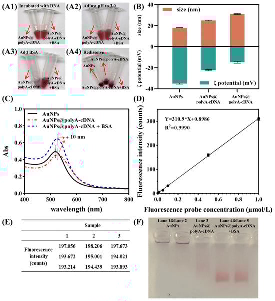AuNPs are widely used as signal molecules in sensors due to their ease of preparation, high sensitivity, low cost, and modifiability [49,50,51,52]. However, conventional thiol-based Au-S conjugation is costly and time-consuming. In this study, we introduced a polyadenine (polyA) sequence to simplify and reduce the cost of nucleic acid-AuNP conjugation using a low-pH method. Under acidic conditions (pH < 4), protonated adenine binds to negatively charged AuNPs via electrostatic interactions. Characterization confirmed successful conjugation: Figure 4(A1–A4) illustrates the preparation process of AuNPs@polyA-cDNA, during which the solution consistently remained a bright cherry red. The addition of nucleic acids and BSA did not disrupt the original structure of the AuNPs. Particle size increased by ~10 nm, and zeta potential shifted by ~10 mV (Figure 4B). A ~10 nm red shift in maximum absorption (Figure 4C) further validated the conjugation. Fluorescence measurements using AF488-labeled polyA-cDNA showed an adsorption rate of 73.5% (Figure 4D,E), indicating efficient nucleic acid loading and enhanced sensor sensitivity.