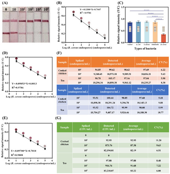For real-sample evaluation, varying concentrations of endospores were added to chicken and tea broth samples. Detection limits were 74.5 and 52.8 endospores/mL, respectively, with a linear range of 10 to 105 endospores/mL (Figure 5D,E). Reproducibility was assessed using three batches of test strips and reagents to detect endospore concentrations of 102 and 104 endospores/mL in blank samples. As shown in Figure 5F, intra- and inter-assay variations were below 12%, indicating good reproducibility. Spiking recovery experiments with different endospore concentrations showed recovery rates between 82.19% and 97.88%, with a coefficient of variation (CV) below 12% (Figure 5G).