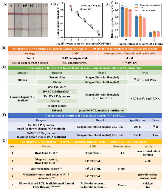 Analysis of endospore-cell mixtures. (A) Detection results for endospore-cell mixtures at concentrations of 0, 10, 102, 103, 104, and 105 CFU/mL. Mixtures are visually detectable at 103 CFU/mL. (B) Linear correlation between the logarithm of endospore-cell mixtures concentration and T/C signal intensity from 10 to 10⁵ CFU/mL; LOD is 6.78 CFU/mL (Each colored circle represents the band color at the corresponding concentration). (C) Stability of FSPCRS-LFB test strips stored at 37 °C for one week, equivalent to one year at 4 °C, showing consistent T/C signal intensities across all concentrations (0, 102, 105 CFU/mL), indicating excellent stability for long-term storage. (D) Comparison of two nucleic acid immobilization strategies for LOD and the concentration of nucleic acid probe used. (E) Comparison of the prices of two methods for nucleic acid immobilization on NC membranes. (F) Comparison of the prices of polymerases used in PCR and RCA. (G) Comparison of our method with recently published methods for detecting B. cereus endospores.