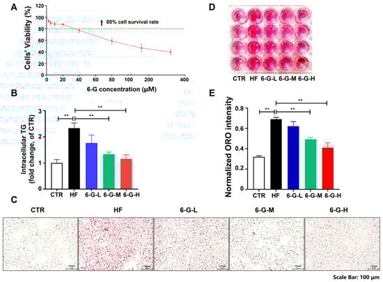 Human hepatocellular carcinoma cell line HepG2 (purchased from China Center for Type Culture Collection, Wuhan, China) was cultured in Dulbecco’s modified Eagle’s medium (DMEM, Gibco, Grand Island, NY, USA) containing 10% fetal bovine serum (Biological Industries, Kibbutz Beit Haemek, Israel) and supplemented with 10 mL/L penicillin-streptomycin (Gibco, New York, NY, USA). Samples of 1.2 × 104 cells per well were planted in 96-well plates (for MTT assay) and 2 × 104 cells per well were planted in 6-well plates (for lipid and protein detection). As previously reported with some modifications [], for modeling the lipid accumulated in vitro, HepG2 cells were serum-starved for 24 h and treated with 20 mM fructose (Solarbio, Beijing, China). Then the cells were treated with various concentrations of 6-G (purity ≥ 98%, purchased from Shanghai Yuanye Biotechnology Co., Ltd., Shanghai, China. Dissolved in DMSO) for further bio-activity tests.