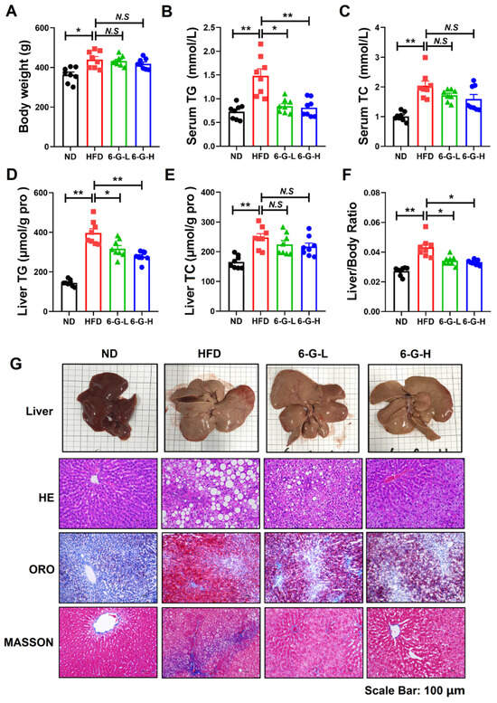 6-G ameliorates metabolic syndrome and hepatic steatosis in HFD-induced disease in rats. (A) Body weight. (B) Serum TG. (C) Serum TC. (D) Liver TG. (E) Liver TC. (F) Ratio of liver/body weight in rats. (G) Liver pathology of rats, including liver images and HE, ORO, Masson staining. ND: normal diet; HFD: high-fructose diet; 6-G-L: 0.1 mg/kg; 6-G-H: 0.4 mg/kg. Data are expressed as mean ± SEM, n = 8 rats per group. ** p < 0.01, * p < 0.05. N.S: no significant differences.