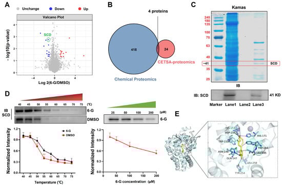 In the current study, we identified that SCD may be a direct binding target of 6-G using both chemical proteomics and cellular thermal shift assay (CETSA)–proteomics. These two methods are well-recognized approaches for target identification as performed in previous studies [,,], and of course, the different methods have their respective strengths and weaknesses. The chemical structure of the small molecule (ligand) is usually modified by chemical proteomics for target identification, which may cause the changes in bio-activity and original binding sites with the targets, leading to false positive identification []. Similarly, the CETSA–proteomics approach for identifying targets has some drawbacks, especially the control of conditions and accuracy of results, such as temperature control, criteria for screening of differential expressed proteins and the one-sidedness of evaluation results, etc., [,]. To improve the accuracy, we performed these two methods in our study for identifying the binding target of 6-G.