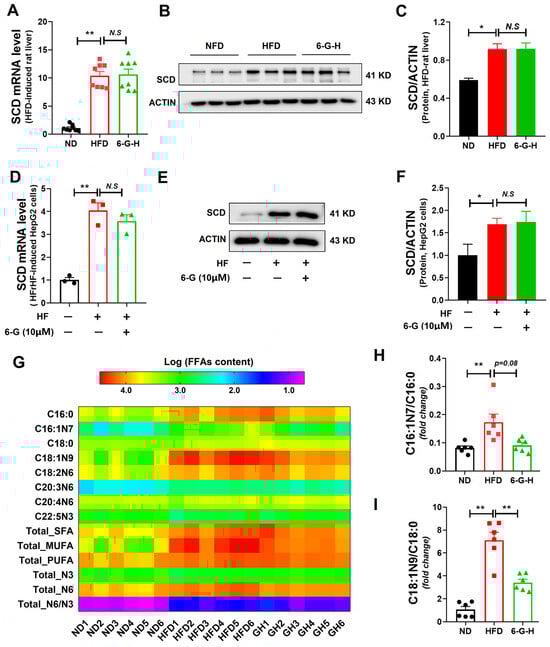 6-G suppresses SCD activity independently of SCD expression regulation. (A) Relative mRNA expression of SCD in rat livers. (B,C) SCD protein levels in rat livers. (D) SCD mRNA levels in HepG2 cells. (E,F) SCD protein expression in HepG2 cells. (G) Heatmap of the representative FFAs. FFAs: free fatty acids. (H,I) Ratios of C16:1N7/C16:0, C18:1N9/C18:0 in rat livers, showing SCD activity. Data are presented as mean ± SEM (in vivo, n ≥ 6/group) and mean ± STD (in vitro, n = 3 independent experiments). ** p < 0.01, * p < 0.05, N.S: no significant differences.