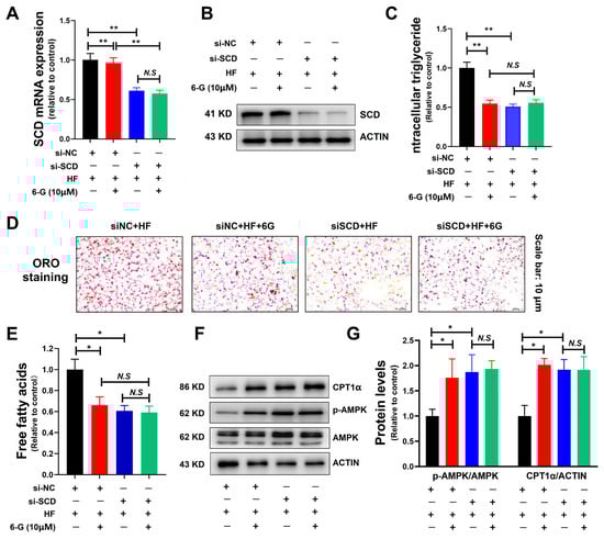 6-G alleviates SCD-mediated DNL and lipid accumulation in HF-induced HepG2 cells. (A,B) Knockdown efficiency of SCD at mRNA and protein levels by qRT-PCR and Western blot. (C) Relative expression of intracellular TG content to control (si-NC). (D) ORO staining. (E) Relative levels of intracellular free fatty acids to control. (F,G) Effect of SCD knockdown on AMPK and CPT1α levels, with or without 6-G treatment. siNC: blank siRNA, siSCD: knockdown of SCD by siRNA. Data are presented as mean ± STD, n = 3 independent experiments. ** p < 0.01, * p < 0.05, N.S: no significant differences.