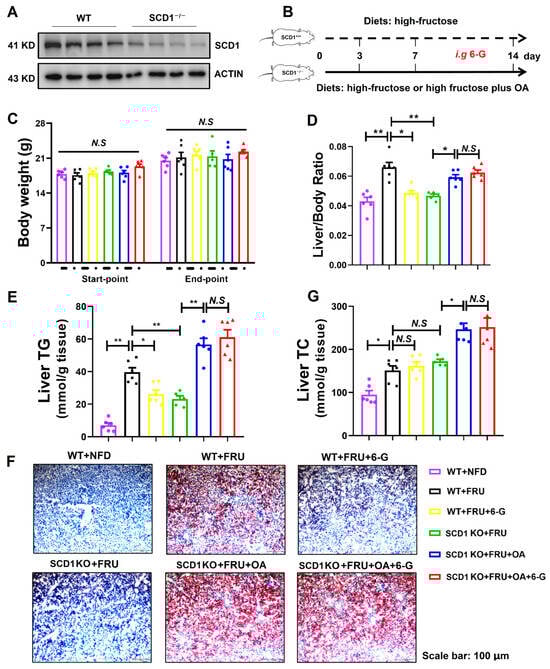 6-G improves fructose-induced hepatic steatosis of mice in a SCD1-dependent manner. (A) SCD1 expression in WT and SCD1−/− mice. (B) Scheme of mouse groupings and 6-G treatment. (C) Body weight of mice. (D) Ratio of liver/body weight. (E) Liver TG. (F) Liver ORO staining. (G) Liver TC. 6-G: 0.8 mg/kg. n ≥ 5 mice for each group. Data are expressed as mean ± SEM, ** p < 0.01, * p < 0.05, N.S: no significant differences.