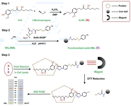 A chemical proteomics approach was used for target identification in vitro as previously described []. Briefly, an alkynyl-6G probe (Al-6G) was synthesized and used to construct Al-6G functionalized magnetic microspheres (Al-6GMMs) for magnetic target fishing. HF-induced HepG2 cells were lysed with IP cell lysis buffer (Beyotime, Shanghai, China) to obtain the total protein lysis solution, and the lysis was incubated with 10 µM Al-6G probe for 6 h. After that, the suspension was treated with Al-6G-MMs and incubated with a catalyst system (100 µM sodium ascorbic acid and 100 µM CuSO4 in PBS) overnight at 4 °C, and then the Al-6G-MMs were separated with magnets. After washing, the enriched micro-spheres were treated with 100 µM dithiothreitol (DTT, Sigma-Aldrich, St. Louis, MO, USA) to obtain the target proteins of 6-G. SDS PAGE was performed to separate the proteins and Western blot was used to define the targets; the gels of SDS-PAGE were identified by HPLC-mass spectrometry (entrusted to Apply Protein Technology, Shanghai, China). The steps of target identification by the chemical proteomics approach are summarized in Figure 7.