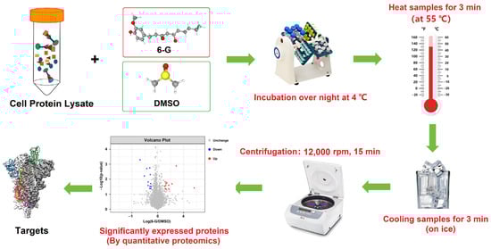 On the other hand, cellular thermal shift assay (CETSA)-integrated quantitative proteomics was also used for target identification [,]. As previously described, with some modifications, in reference [], the cell lysate from HF-induced HepG2 cells was divided into two aliquots and treated with DMSO and 6-G overnight at 4 °C, respectively. Afterwards, these two aliquots were heated for 3 min at 55 °C (according to the pre-experimental results, the protein concentration for heat treatment at 55 °C showed a maximum statistical difference between the cell lysate treated with DMSO and 6-G) and then cooled on ice for 3 min immediately. The supernatants (after high-speed centrifugation) were analyzed for the differential proteins by quantitative proteomics analysis (entrusted to Apply Protein Technology, Shanghai, China). Western blot was used to identify the target after the supernatants were separated by SDS-PAGE. The experiments were repeated three times. The technology roadmap for CETSA-integrated proteomics is shown in Figure 8.