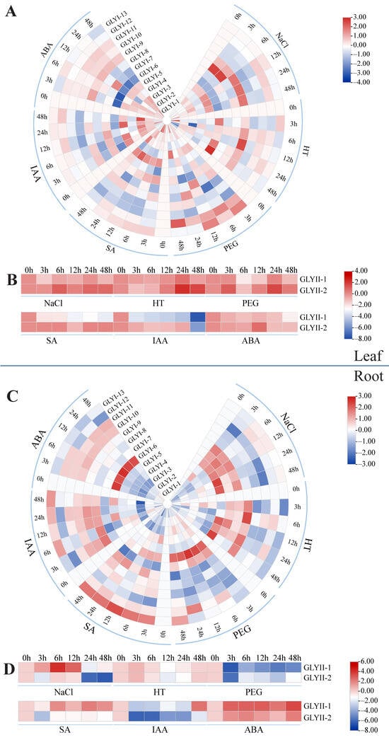 Zhu, K.; Zhang, Y.; Shen, W.; Yu, L.; Li, D.; Zhang, H.; Miao, C.; Ding, X.; Jiang, Y. Genome-Wide Analysis and Expression Profiling of Glyoxalase Gene Families Under Abiotic Stresses in Cucumber (Cucumis sativus L.). Int. J. Mol. Sci. 2024, 25, 11294. https://doi.org/10.3390/ijms252011294