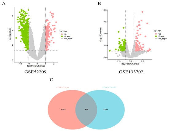 Identification of common DEGs. (A,B) Volcano plot revealing DEGs between the control group and HH-Day. (C) A total of 334 common DEGs were identified after taking the intersection of the DEGs in GSE52209 and GSE133702.