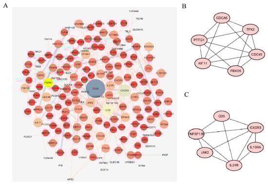 The PPI network was first constructed in the STRING database to determine the interactions among the common DEGs. Cytoscape was used to visualize the common genes (Figure 4A), and the MCODE algorithm was used to find the closely connected protein groups in the target network, with the top two modules displayed in Figure 4B,C. Cluster 1 contained six potential hub genes, KIF11, CDCA5, CDC45, TPX2, FBXO5 and PTTG1, which belong to essential genes for life. Cluster 2 contained six potential hub genes, IL15RA, CD5, TNFSF13B, IL21R, JAK2 and CXCR3, which are highly enriched in inflammatory response pathways.