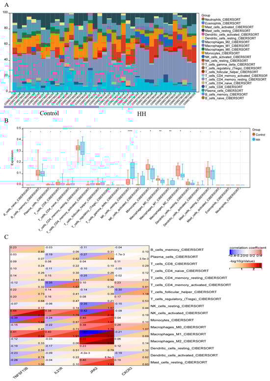 As shown in the histograms (Figure 5A), the proportions of different subtypes of immune cells change following hypoxia on the plateau. Significant differences were demonstrated between the HH and control groups of five immune cell types (p < 0.05). After exposure to a hypobaric hypoxic environment for seven days, there were significant decreases in monocytes and M0 and M2 macrophages in the human peripheral blood, as well as significant increases in M1 macrophages and NK cells.