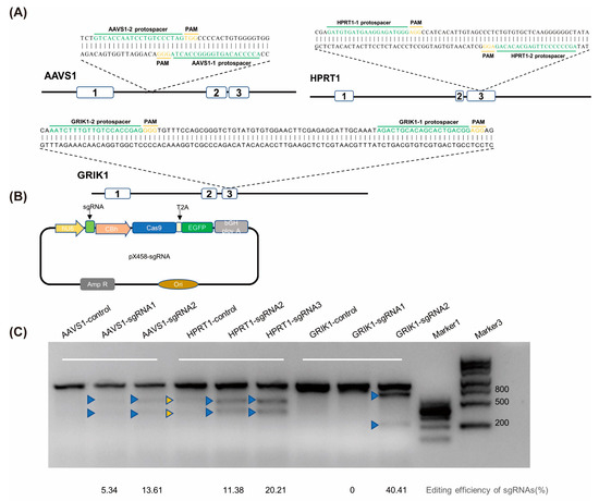 The editing efficiency of different targets. (A) Six targets of three gene loci—AAVS1, HPRT1, and GRIK1—were selected. (B) The plasmid structure of pX458-sgRNA was constructed. (C) T7E1 detection. The plasmid pX458-sgRNA was transfected into cells. The blue arrows represent strips of DNA cut after T7E1 treatment.