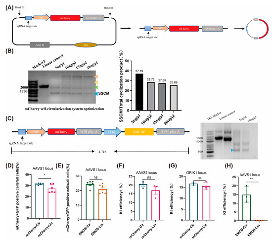 Circular donors improved the percentage of donor-transfected cells. (A) mCherry template diagram. The plasmid containing the donor template was cut with Hind III, purified and circularized using T4 ligase. The linear donor template is a PCR product with the same sequence as the donor template. (B) Optimization of the circularization system. On the left, different DNA concentration gradients for circularization are shown. The orange arrow indicates the multimolecular Circularization Product 1 (loose), the yellow arrow indicates the multimolecular Circularization Product 2 (helical), the green arrow indicates the nicked single molecule circularization product, and the blue arrow indicates the superhelical single molecule (SSCM). The right image shows the gray-scale value analysis results of SSCM percentage using Image J (version 1.53). (C) EMCB template diagram and circularization system. (D,E) Flow analysis of mCherry and EMCB template transfection efficiency at the AAVS1 locus. The co-transfection efficiency of the circular donor and pX458-sgRNA was significantly higher than that of the linear donor and pX458-sgRNA (N = 6). (F) The PCR-verified clone acquisition rate of the mCherry-Cir template at the AAVS1 site of HeLa cells was not significantly higher than that of the mCherry-Lin template, but both were higher than the linear template (mCherry-Lin2) containing only the target fragment (N = 3). (G) No significant difference was observed between the mCherry-Cir template and mCherry-Lin template at the GRIK1 site of HeLa cells (N = 3). (H) The PCR-verified clone acquisition rate of the EMCB template at the AAVS1 site of HEK-293T (N = 3). (D–H) Data are presented as the mean ± SD from three independent experiments. Significance was calculated using unpaired Students’ t-tests: (ns) p > 0.05, (*) p < 0.05, (**) p < 0.01.
