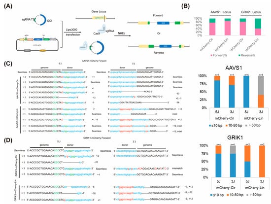 Analysis of integration efficiency and integration patterns of the linear and circular mCherry template. (A) Patterns of different integration directions for the circular donor fragment. (B) Integrations of the mCherry template at the AAVS1 and GRIK1 loci. (C,D) Statistics of forward integration indels of the circular and linear mCherry template at different sites.