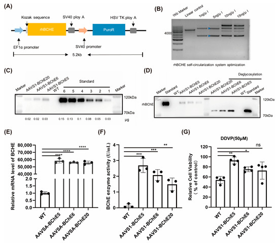 Validation analysis of HeLa cell clones with integrated rhBCHE. (A) Schematic diagram of the rhBCHE template. (B) Circularization system of the rhBCHE template. Yellow and blue arrows represent multimolecular and monomolecular products, respectively, in the 5 ng/μL circularization system. (C) Western blot analysis. After ultrafiltration, the cell supernatant was analyzed by Western blot using different amounts of rhBChE standards as control. (D) Deglycosylation assay of the supernatant protein. The molecular weight of the supernatant protein decreased following deglycosylation with rhBChE standard. (E) qPCR detection of BCHE transcription levels. (F) Analysis of supernatant protein activity. The activity of supernatants protein after ultrafiltration from different cells was determined using the Ellman assay. (G) Determination of anti-DDVP activity. A 50 μm concentration was determined as the median lethal concentration dose for WT HeLa cells, and cell viability in other clones was measured relative to this (N = 4). (C,E,G) Data are presented as the mean ± SD from three or four technical replicates. Statistical analysis was performed using an unpaired Student’s t-test. (*) p < 0.05, (**) p < 0.01, (***) p < 0.001, (****) p < 0.0001.