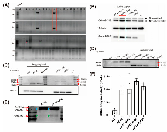 For the above three clones, the supernatant and intracellular proteins were deglycosylated for Western blot analysis. The results demonstrated that the molecular weight of the bands decreased to 68 kDa after deglycation, indicating that both intracellular and supernatant proteins contained glycosylated BChE (Figure 5C,D). AF44 and AF44-GR6 were selected for the analysis of rhBChE polymers. It is well-known that hBChE exists in monomer, dimer, and tetramer forms. The results indicated that the supernatant of AF44 and AF44-GR6 mainly contained dimeric rhBChE and a small amount of monomeric rhBChE (Figure 5E). Subsequently, we measured the activity of rhBChE in the supernatant, and the results revealed that the rhBChE activity in supernatant of AF44-GR6 was significantly higher than that of AF44 (Figure 5F). In conclusion, the expression level and rhBCHE activity of the reverse-integrated clone were significantly higher than those in the single-copy forward-integrated clone.