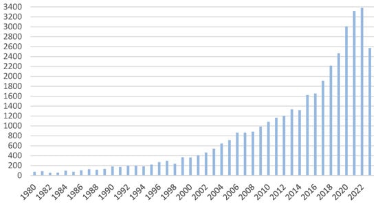 The development of PDT technology since 1980 has brought about numerous innovations and advances that have significantly improved the effectiveness and application of this method in medicine (Figure 4). The main aspects of PDT development include the selection of appropriate photosensitizing drugs, the improvement of light source technology, the adaptation of dosing protocols, the development of imaging, and the miniaturization of devices. Over the years, interest in PDT has grown at a dynamic pace, as evidenced by the number of scientific works published in the years 1980–2023. The smallest number of works written occurred in 1982 and amounted to 53 works, while their largest number in 2022 reached 3381. This shows how dynamically this field is developing and how much interest there is among scientists in this treatment method.