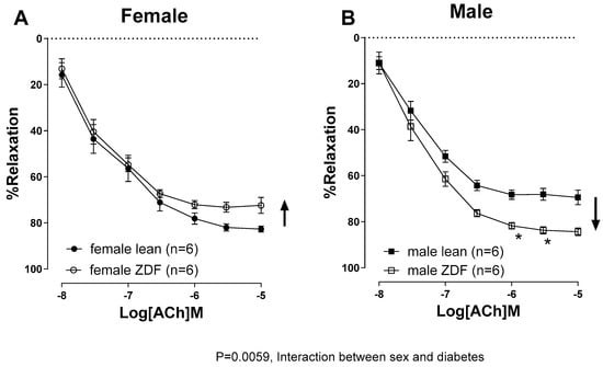 Acetylcholine (ACh, 10−8 to 10−5 M)-induced vasorelaxation in phenylephrine pre-contracted aortic rings from female (A) and male (B) lean and ZDF rats. Data are presented as mean ± SEM. n = 6 per group, analyzed using a three-way ANOVA followed by Tukey’s post hoc test. * p < 0.05 vs. male lean at the corresponding concentration of ACh.