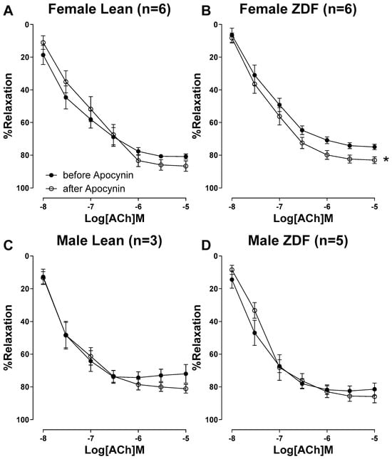 Acetylcholine (ACh, 10−8 to 10−5 M)-induced vasorelaxation in phenylephrine pre-contracted aortic rings from female lean (A), female ZDF (B), male lean (C), and male ZDF (D) rats. Relaxation to ACh was measured before and after incubation with Apocynin (100 μM), a NADPH oxidase inhibitor. Data are expressed as mean ± SEM. n = 3–6, analyzed using a two-way ANOVA with repeated measures. * p < 0.05 vs. before Apocynin.