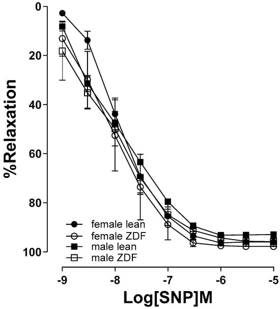Sodium nitroprusside (SNP, 10−9 to 10−5 M)-induced vasorelaxation in phenylephrine pre-contracted aortic rings from male and female lean and ZDF rats. Data are expressed as mean ± SEM. n = 4–7, analyzed using a three-way ANOVA.