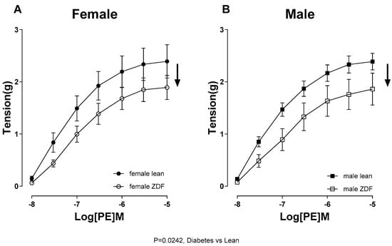 Phenylephrine (PE, 10−8 to 10−5 M)-induced vasoconstriction in aortic rings from female (A) and male (B) lean and ZDF rats. Data are expressed as mean ± SEM. n = 7 per group, analyzed using a three-way ANOVA followed by Tukey’s post hoc test.