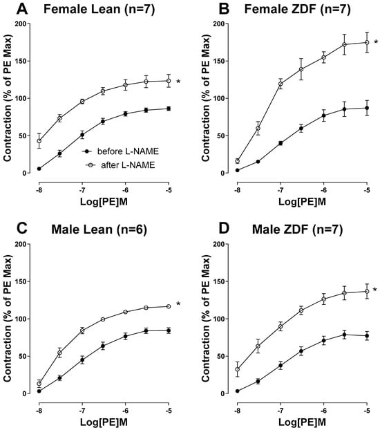 Phenylephrine (PE, 10−8 to 10−5 M)-induced vasoconstriction in aortic rings from female lean (A), female ZDF (B), male lean (C), and male ZDF (D) rats. Contractile responses to PE were generated before and after the addition of L-NAME (200 μM) in the presence of indomethacin (Indo, 10 µM). Data are expressed as mean ± SE. n = 6–7, analyzed using a two-way ANOVA with repeated measures. * p < 0.05 vs. before L-NAME in all groups.