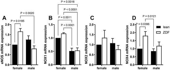eNOS (A), NOX1 (B), NOX2 (C), and NOX4 (D) mRNA expression in male and female lean and ZDF rat aortas. Data are presented as mean ± SEM. n = 6, the mRNA expression levels of control lean female rats were arbitrarily normalized and set as one. Statistical differences (p < 0.05) between two groups are denoted by capped lines, analyzed using a two-way ANOVA followed by Tukey’s post hoc test.