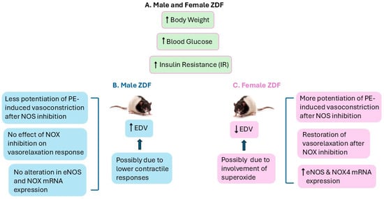 Proposed scheme based on the data presented in this study. Both ZDF male and female rats exhibited increased body weight, elevated glucose levels, and insulin resistance (IR) ((A) green one). EDV was increased in the aortic rings from ZDF male rats, possibly due to enhanced contractile responses ((B) blue one), but was impaired in female ZDF rats, possibly due to the elevated involvement of superoxide ((C) pink one). EDV, endothelium-dependent vasorelaxation; PE, phenylephrine; NOS, nitric oxide synthase; eNOS, endothelial nitric oxide synthase; NOX4, NADPH oxidase 4; ↑ Increase, ↓ decrease.
