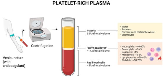 - dos Santos, R.G.; Santos, G.S.; Alkass, N.; Chiesa, T.L.; Azzini, G.O.; da Fonseca, L.F.; dos Santos, A.F.; Rodrigues, B.L.; Mosaner, T.; Lana, J.F. The Regenerative Mechanisms of Platelet-Rich Plasma: A Review. Cytokine 2021, 144, 155560. [Google Scholar] [CrossRef] [PubMed]
