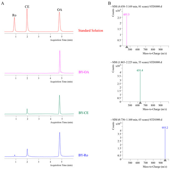 Liquid chromatography–mass spectrometry (LC-MS) detection of target products. (A) Liquid chromatographic analysis of the standard and extract samples. The red curve represents the standard solution containing oleanolic acid (OA), calenduloside E (CE), and ginsenoside Ro (OA). The pink, green, and blue curves represent the extract samples from the cultures of strains BY-OA, BY-CE, and BY-Ro, respectively. (B) Mass spectrometric detection of the standards.