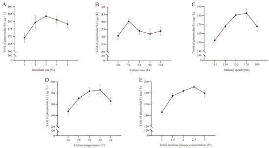 The effect of different cultivation conditions on the yield of ginsenoside Ro in strain BY-Ro. (A) Inoculum size. (B) Culture time. (C) Shaking speed. (D) Culture temperature. (E) Initial medium glucose concentration.