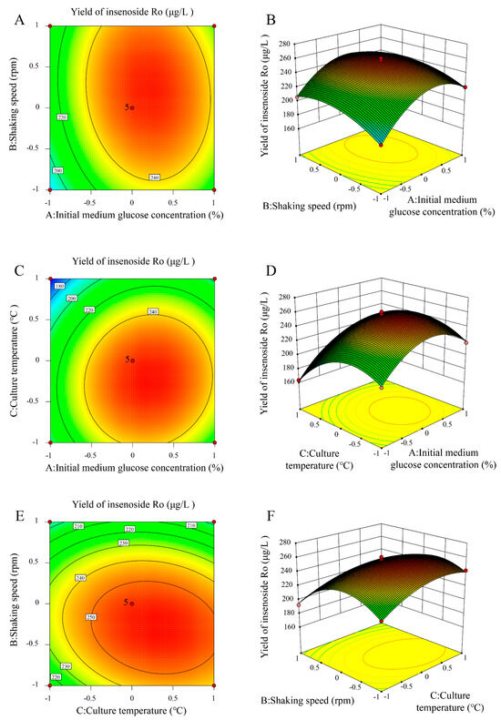 As shown in Figure 3A, when the culture temperature is constant, the contour plot appears as a closed ellipse, and the response surface is convex, indicating a strong interaction between initial medium glucose concentration and shaking speed, with a maximum value. The response surface plot (Figure 3B) shows that with increases in initial medium glucose concentration and shaking speed, the ginsenoside Ro yield initially increases, then decreases. As shown in Figure 3C, when the shaking speed is constant, the contour plot indicates a certain interaction between initial medium glucose concentration and culture temperature, with a maximum value. The response surface plot (Figure 3D) shows that with increases in initial medium glucose concentration and culture temperature, the ginsenoside Ro yield also initially increases, then decreases. As shown in Figure 3E, when the initial medium glucose concentration is constant, the contour plot indicates a certain interaction between shaking speed and culture temperature, with a maximum value. The response surface plot (Figure 3F) shows that with an increase in shaking speed, the ginsenoside Ro yield shows an increasing trend, while with an increase in culture temperature, the ginsenoside Ro yield initially increases, then decreases.
