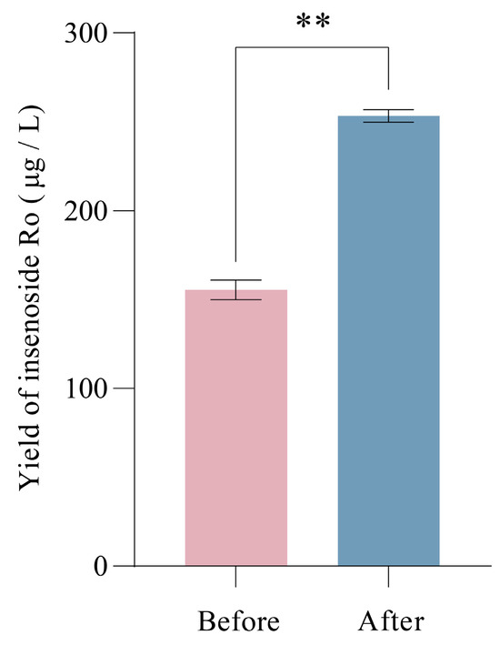 Comparison of the yield of ginsenoside Ro in strain BY-Ro before and after the optimization of fermentation conditions (** for significance of p ≤ 0.01).
