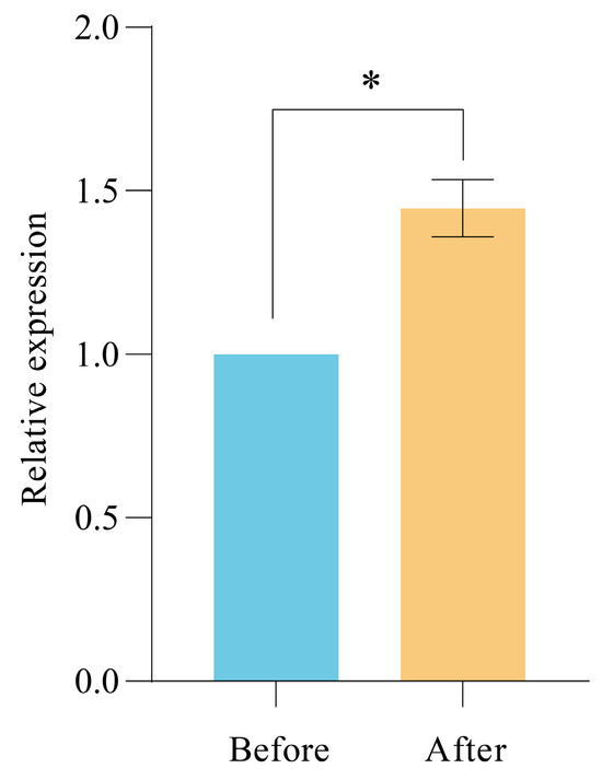 Comparison of the relative expression levels of PgUGAT252645 in strain BY-Ro before and after the optimization of fermentation conditions (* for significance of p ≤ 0.05).