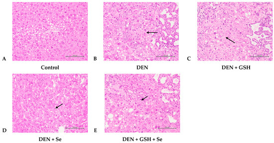 Histopathological changes of altered hepatocellular foci in mice at week 20 (400×). (A) Normal hepatocytes were observed in the control group. (B) Multifocal, moderately to severely altered hepatic foci (arrow), and moderate to severe bile duct and oval hyperplasia with inflammation and fibrosis were observed in the DEN group. (C–E) Multifocal, slightly to moderately altered hepatic foci (arrow), and slight to moderate bile duct and oval hyperplasia with inflammation and fibrosis. H&E stain, 400×. DEN, diethylnitrosamine; GSH, glutathione; Se, selenium.