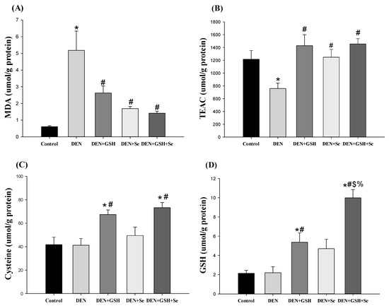 As demonstrated in Figure 4, oxidative stress, GSH, and its related antioxidant enzyme activity in liver tissue were compared among the five treatment groups. DEN mice supplemented with GSH, Se, or both exhibited significantly lower MDA levels but higher trolox equivalent antioxidant capacity (TEAC) levels in liver tissue compared with DEN mice; nonetheless, these levels were similar to those of control mice (Figure 4A,B). GSH supplementation in DEN mice significantly increased liver cysteine and GSH levels compared with other treatments (Figure 4C,D). However, a higher GSH/GSSG ratio was observed in the DEN + GSH + Se group (Figure 4F). Hepatic GPx, GR, and GST activities were slightly or significantly lower in DEN mice than in control mice (Figure 4G–I). Supplementation with GSH and Se in DEN mice elicited activities comparable to or greater than those observed in control mice.