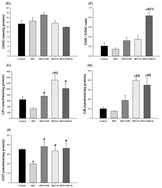 Oxidative stress and GSH-related antioxidant activity in the liver tissue of mice with DEN-induced altered hepatocellular foci at week 20. (A) MDA, (B) TEAC, (C) Cysteine, (D) GSH, (E) GSSG, (F) GSH/GSSG ratio, (G) GPx activity, (H) GR activity, and (I) GST activity were analyzed. Reported values are expressed as the mean ± SE (n = 6). * Indicates a significant difference from the control group; # indicates a significant difference from the DEN group; $ indicates a significant difference from the DEN + GSH group; % indicates a significant difference from the DEN + Se group (one-way ANOVA followed by the Student–Newman–Keuls test, p < 0.05). DEN, diethylnitrosamine; GSH, glutathione; Se, selenium; MDA, malondialdehyde; TEAC, trolox equivalent antioxidant capacity; GSSG, glutathione disulfide; GPx, glutathione peroxidase; GR, glutathione reductase; GST, glutathione S-transferase.