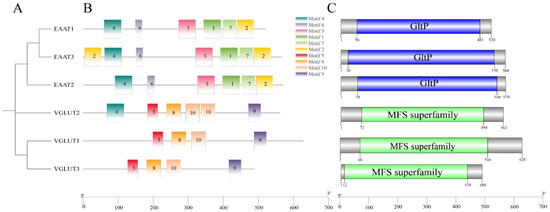 A domain analysis showed that all excitatory amino acid transporters contain the GltP domain (Figure 1C). CgVGLUT1 and CgVGLUT3 contain an MFS domain (Figure 1C). Further exploration of motifs in C. gigas glutamate transporters revealed ten conserved motifs (Figure 1A,B). CgEAATs have six common motifs: motifs 1, 2, 3, 4, 6, and 7, with CgEAAT3 also containing motif 2. CgVGLUTs share four common motifs: motifs 5, 8, 9, and 10, with CgVGLUT2 containing two copies of motif 10 and an additional motif 4.