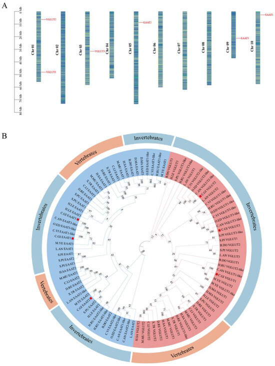 Chromosomal localization and phylogenetic analysis of glutamate transporter genes in Pacific oysters. (A) Chromosomal distribution of the six identified glutamate transporter genes across the 10 chromosomes of Pacific oysters. Chromosome numbers (Chr 01–Chr 10) are displayed on the left side of the chromosomes, and gene names are shown on the right side. (B) Phylogenetic tree of multiple species: constructed using the neighbor-joining method in MEGA-X, with Pacific oyster glutamate transporters marked by red squares. Different colors represent branches of different subfamilies (CgVGLUT: red; CgEAAT: blue).