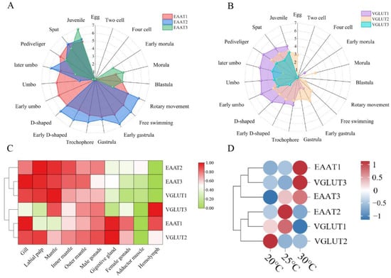 Temporal and spatial expression characteristics of glutamate transporter genes in Pacific oysters and their expression patterns under different temperature stresses. (A) Expression profiles of excitatory amino acid transporter genes in Pacific oysters at various developmental stages from egg to larvae. (B) Expression profiles of vesicular amino acid transporter genes in Pacific oysters at various developmental stages from egg to larvae. (C) Summary of the expression levels of glutamate transporter genes in the gill, labial palps, the mantle, the mantle edge, the outer mantle edge, the male gonad, the digestive gland, the female gonad, the adductor muscle, and the hemolymph cells based on Log2RPKM. (D) Expression patterns of glutamate transporter genes in the gill tissues of Pacific oysters under different high-temperature stresses.