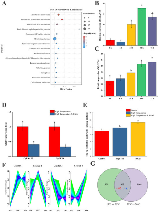 Mechanism of CgEAAT3 response to high-temperature stress. (A) Top 15 KEGG enrichment terms for differentially expressed genes with similar trends to CgEAAT3, identified under both 25 °C and 30 °C stress conditions. (B) Fold change in expression of the CgEAAT3 gene under high-temperature stress. (C) Fold change in expression of the CgGPX4 gene under high-temperature stress. (D) Fold change in expression of the CgEAAT3 and CgGPX4 genes after interference with CgEAAT3 under high-temperature stress. (E) Changes in iron content in gill tissues after interference with CgEAAT3 under high-temperature stress. (F) Temperature trends and clustering of gene expression under different temperature stresses analyzed using Mfuzz. The x-axis represents the three temperatures, and the y-axis represents the normalized intensity ratios (log2 transformed) at each stage. (G) Differentially expressed genes showing a similar trend to CgEAAT3 at 25 °C and 30 °C compared to the control group. Red indicates upregulated genes, and blue indicates downregulated genes. Significant differences between groups are indicated by different letters (a, b, c), with statistical significance set at p < 0.05.