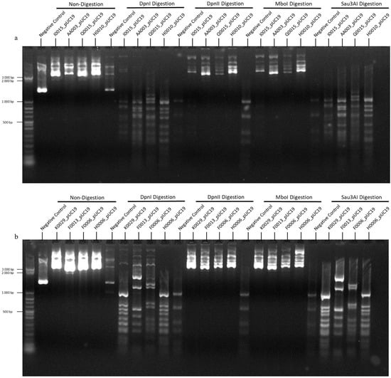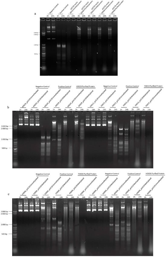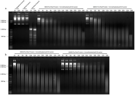 Endonuclease activity confirmation was observed by incubation of unmethylated pUC19 with 10 mg/mL purified RMS proteins. After 2 h, incomplete digestion was observed. However, after 24 h, pUC19 was completely digested by the B. afzelii RMS (Figure 2a,b) and the B. garinii RMS (Figure 3a) proteins, indicating specific endonuclease activity.