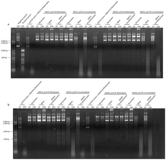 Incubation of purified RMS proteins of B. afzelii ((a)—I0015 and Q0015; (b)—H0010 and AA003) with the respective methylated and unmethylated plasmid to verify methylation protection against endonuclease activity. The negative control, pUC19, was incubated with the protein-free digestion buffer for 24 h. In the positive control, pUC19 was incubated with a digestion buffer and MboI. Vector pUC19 was incubated with all RMS proteins for 24 h as a control of digestion. Methylated and unmethylated RMS plasmids were incubated for 24 h in a digestion buffer without protein as a negative control, incubated for 24 h in a digestion buffer with MboI enzyme as a positive control and incubated for 24 h in a digestion buffer with the respective pure RMS protein. A 50 bp DNA step-ladder from Sigma-Aldrich was used.