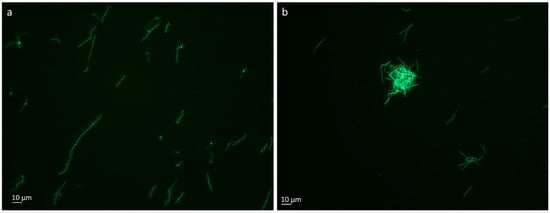 Fluorescence of spirochetes transformed with GFP plasmids. (a) B. burgdorferi B31 transformed with in vitro methylated pBSV2_OspA_GFP and grown in a modified BSK II medium at 34 °C. (b) B. afzelii patient isolate was transformed with in vitro methylated pBSV2_OspA_GFP and grown in the same conditions. Both photos were taken using a Nikon Eclipse TE300 Inverted Fluorescence Phase Contrast Microscope (Nikon GmbH, Vienna, Austria) using a 40× objective.