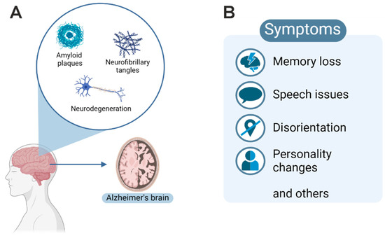 (A) Overview of histopathological features leading to cortical atrophy of the gyri with enlarged sulcal spaces (depicted as Alzheimer’s brain). (B) Various neurological symptoms, including memory loss, are associated with disease progression.
