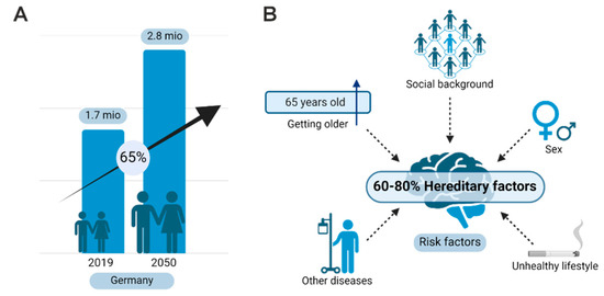 A 65% increase in cases from 2019 to 2050 is expected only in Germany [24]. Genetics are very strong, as hereditary factors were considered at 80% among age, social background, female sex, or unhealthy lifestyle (Figure 2A,B) [25].